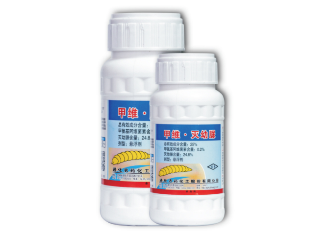 本品由甲氨基阿維菌素苯甲酸鹽與滅幼脲復(fù)配而成。甲氨基阿維菌素苯甲酸鹽作用機理是擾亂害蟲神經(jīng)傳導(dǎo)而使身體麻痹死亡。滅幼脲為苯甲酰脲類昆蟲幾丁質(zhì)合成抑制劑,通過抑制昆蟲幾丁質(zhì)的合成從而導(dǎo)致昆蟲不能正常蛻皮而死。以胃毒為主兼觸殺作用,可用于防治甘藍小菜蛾和楊樹美國白蛾。本品外觀為乳白色懸浮液體,無刺激性氣味。